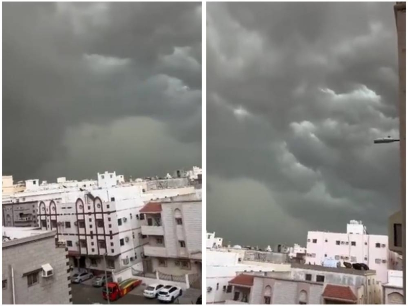 وأظهر مقطع الفيديو السماء في مدينة جدة حوالي الساعة الواحدة بعد الظهر وهي مليئة بالغيوم السوداء الكثيفة.
