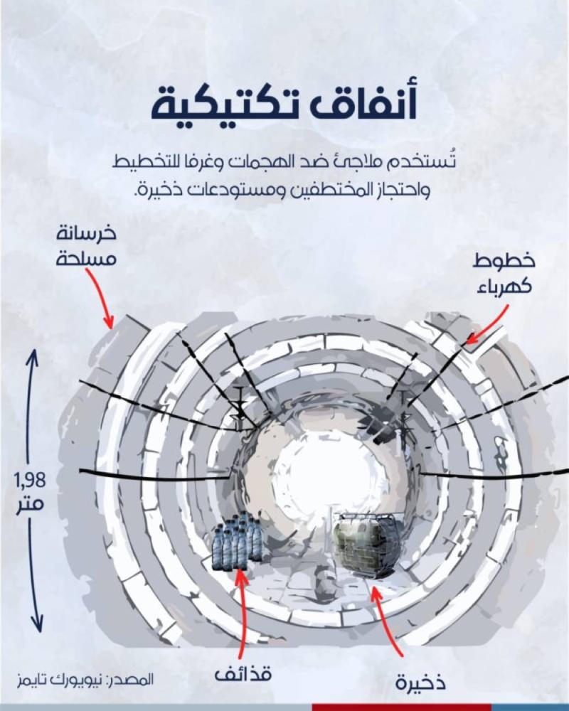 وأوضحت الصحيفة أن هناك أنفاق تكتيكية تستخدم كملاجئ ضد الهجمات، وتحتوي على غرف للتخطيط واحتجاز الخاطفين، ومستودعات للذخيرة. وأضاف التقرير أنه تم رصد خطوط الكهرباء والخرسانة المسلحة داخل الأنفاق، بالإضافة إلى وجود قذائف وذخائر.