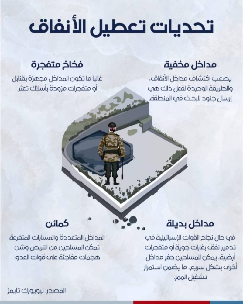 وأضاف التقرير أن الأنفاق تحتوي على ممرات تستخدم لإدخال المعدات والأغذية والمواشي، بالإضافة إلى الأسلحة والذخائر، كما تحتوي على خطوط الكهرباء والسكك الحديدية. وأشارت الصحيفة إلى أن التحديات التي تواجه جهود تعطيل الأنفاق تتمثل في وجود مداخل مخفية يصعب اكتشافها، وإمكانية وجود مداخل بديلة يمكن حفرها بسرعة، إضافة إلى وجود كمائن ومفخخات ناسفة تعرقل عمل القوات الإسرائيلية. القوات أثناء تدمير الأنفاق.