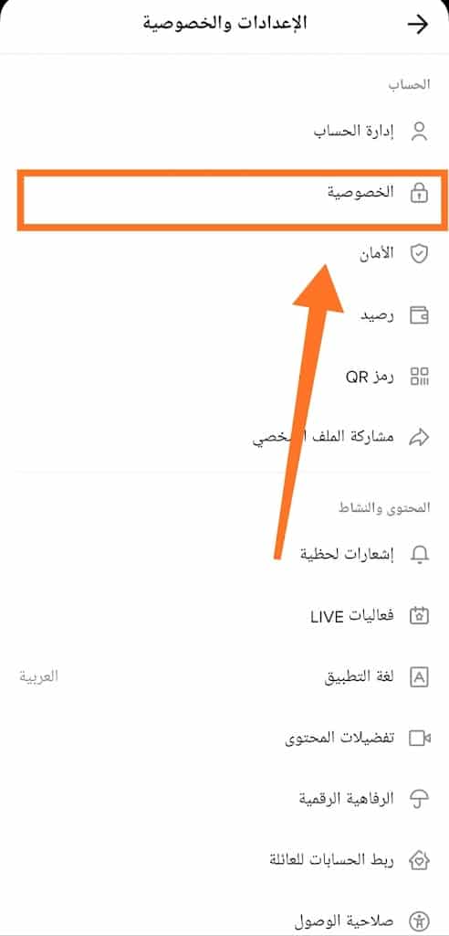 في القائمة التالية بحسابك ، انقر على زر “الخصوصية” ؛