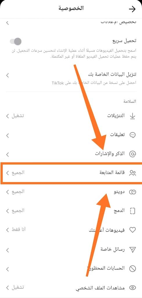 قم بالتمرير لأسفل حتى تجد خيار “قائمة المستخدمين المتابعين” وانقر فوقه ؛