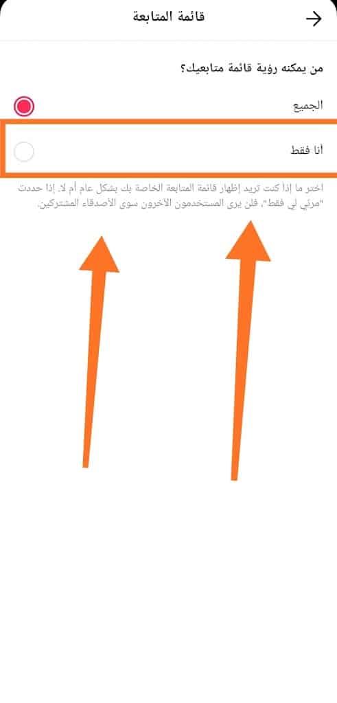 هناك خياران محتملان: “الجميع” و “أنا فقط”. اترك الخيار الثاني محددًا والعودة إلى ملف التعريف الخاص بك. بهذه الخطوة خطوة ، تمكنت من إخفاء من أتابع على TikTok. ما عليك سوى اتباع الدليل وستنتهي!