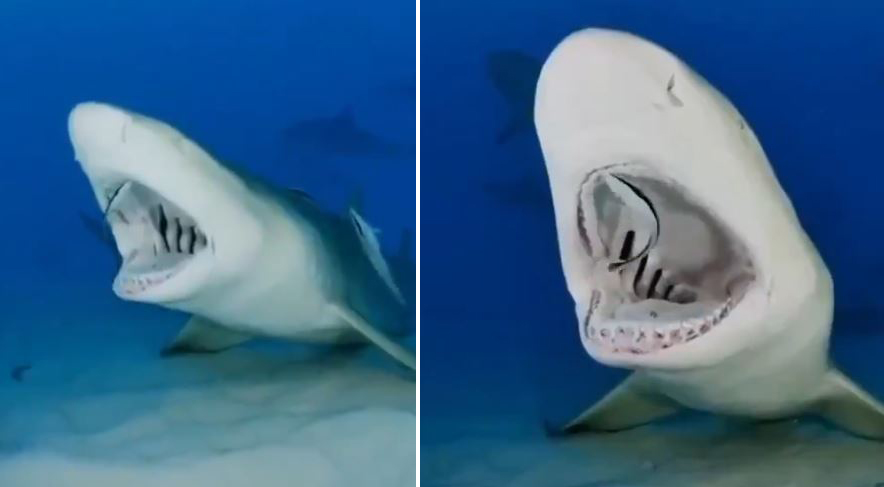 مشهد نادر يرصد ما تفعله سمكة اللزاق داخل فم قرش ضخم