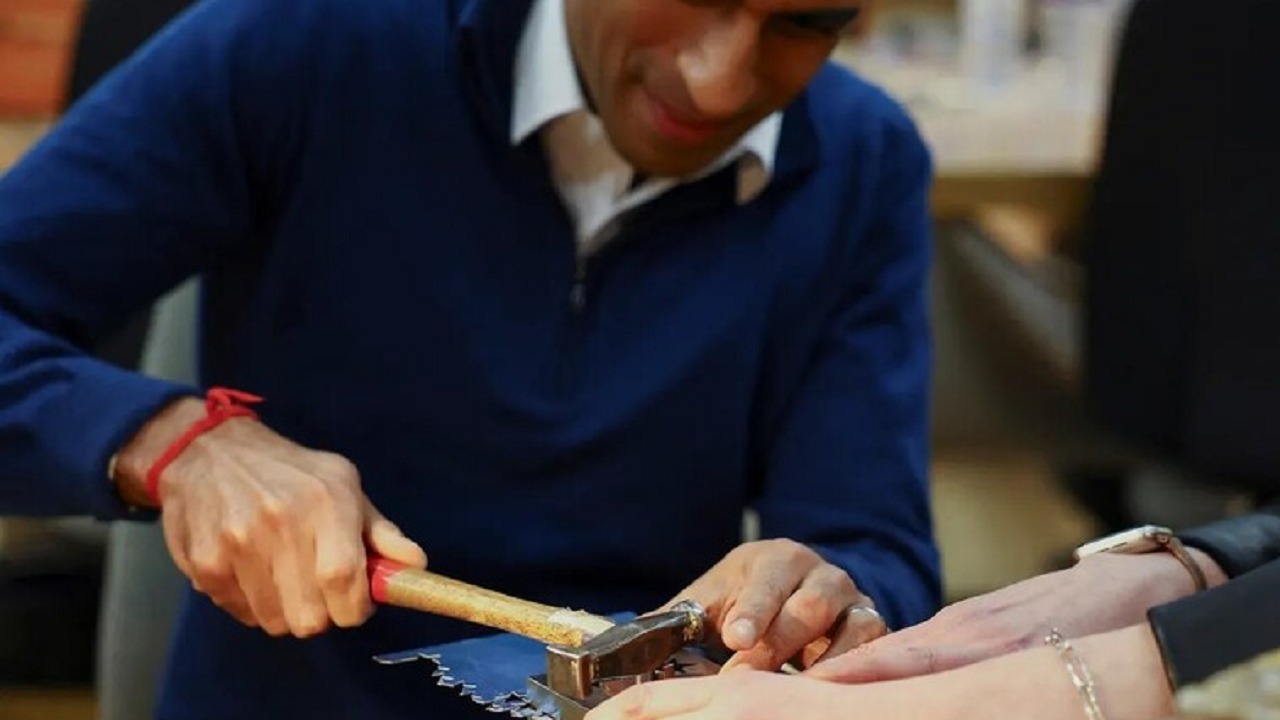 انتشر مقطع فيديو على مواقع التواصل الاجتماعي يظهر رئيس الوزراء البريطاني ريشي سوناك وهو يستخدم مطرقة بطريقة خاطئة.