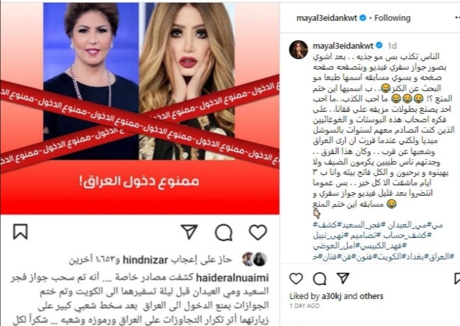 استنكرت الإعلامية مي العيدان، ما تم تداوله من شائعات حول منعها من دخول العراق، بعد زيارتها الأخيرة مع الإعلامية فجر السعيد، وختم جوازي سفرهما بختم يمنعها من دخول الأراضي العراقية مرة أخرى.