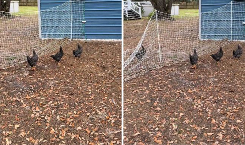 شاهدت امرأة ظاهرة غريبة، حيث توقفت دجاجاتها فجأة عن الحركة في نفس الوقت، ونظرت في اتجاه واحد.