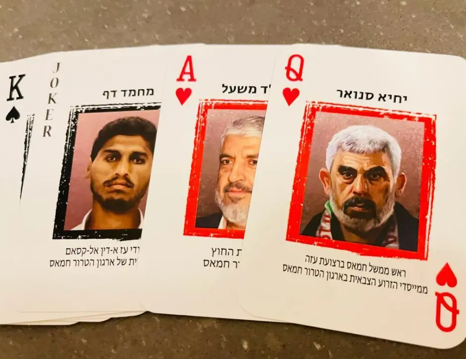 على طريقة الجيش الأميريكي مع صدام.. شاهد إسرائيل توزع أوراق لعب بصور قادة حماس,