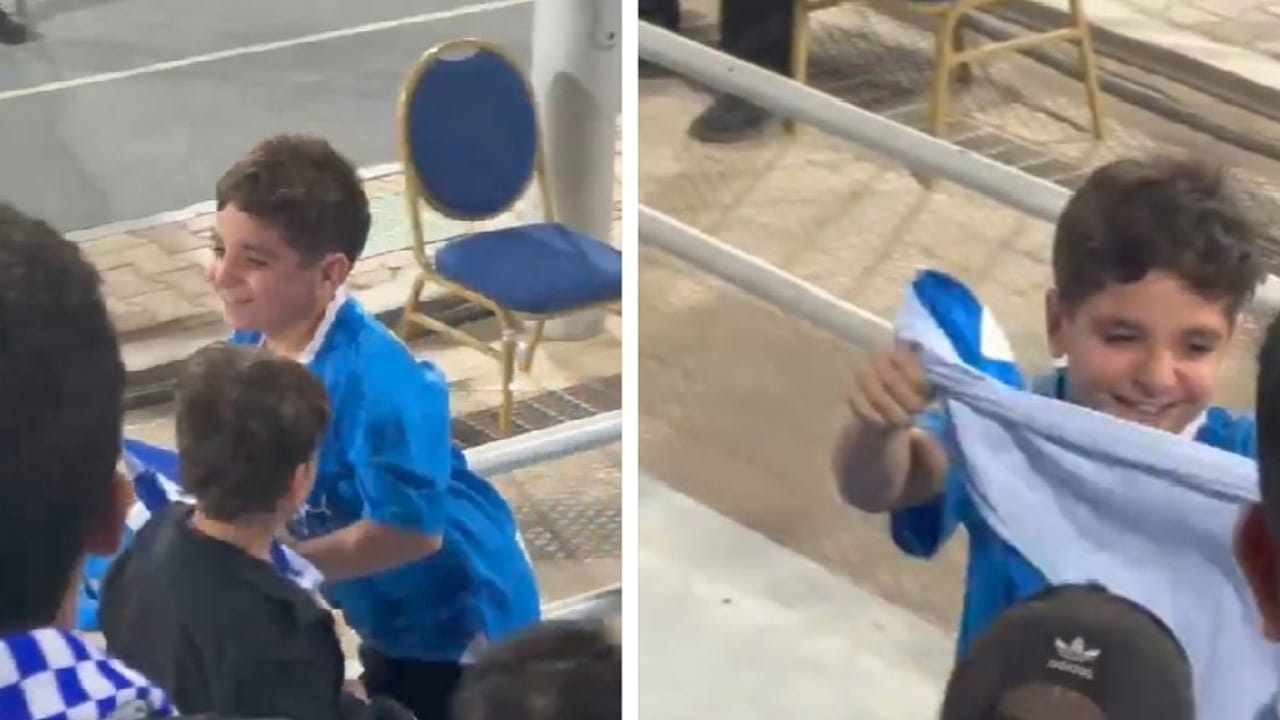 شاهد.. طفل هلالي يطير فرحًا بتيشيرت ميشيل,