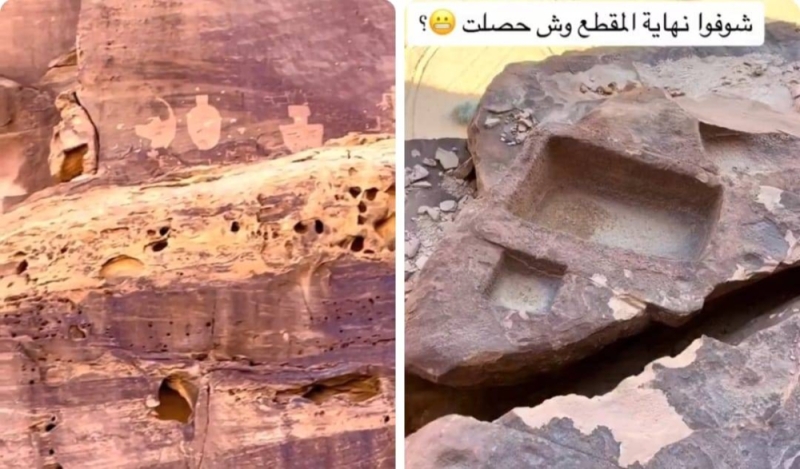 وظهر المواطن في الفيديو وهو يتجول في منطقة جبلية، مشيراً إلى وجود رسومات ونقوش تعود إلى العصور القديمة.