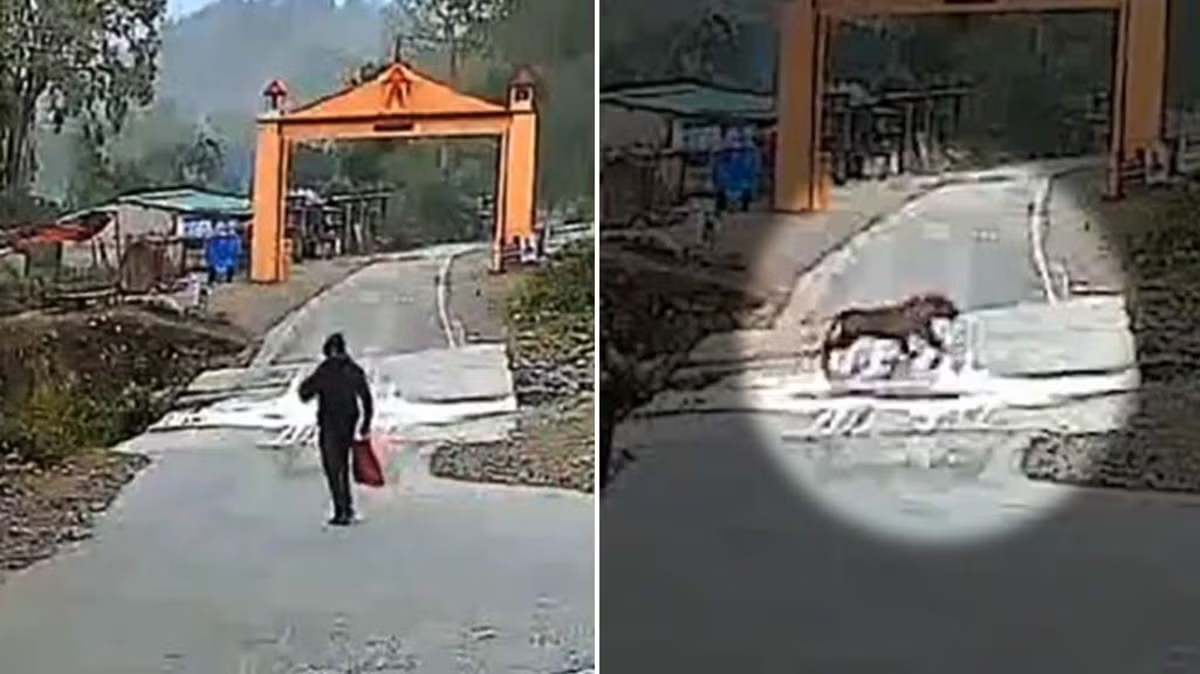 وظهر الرجل في الفيديو وهو يتراجع ببطء إلى الوراء، بينما كان النمر يسير في الاتجاه المعاكس. وبعد أن عبر النمر الطريق، اختفى بين الأشجار.