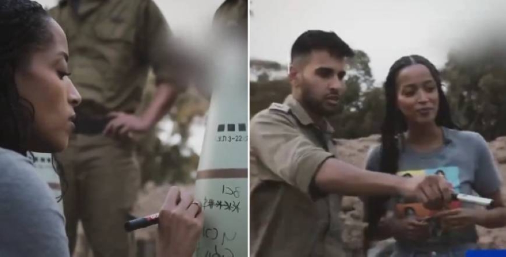 شاهد مذيعة إسرائيلية توقع على القذائف التي تُطلق نحو قطاع غزة,