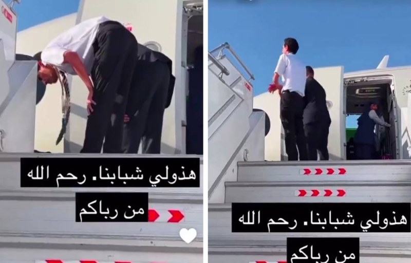 أدى شابان سعوديان الصلاة أمام باب الطائرة على الدرج، حرصا على عدم تفويتها.