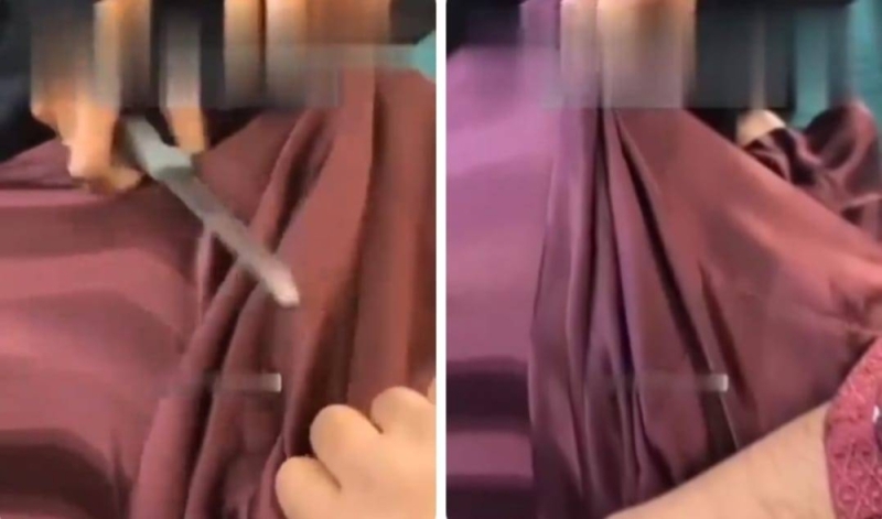 وأظهر الفيديو المتداول المرأة وهي تمزق الفستان باستخدام “سكين”، بدافع الغيرة على ما يبدو.