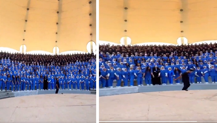 ووقف الطلاب في الصفوف الخلفية، بينما وقفت الطالبات في الصفوف الأمامية. انطلق أحد الشباب من الصفوف الخلفية وقام بحركة رونالدو الشهيرة وهي رفع يده اليمنى والتلويح بها في الهواء.