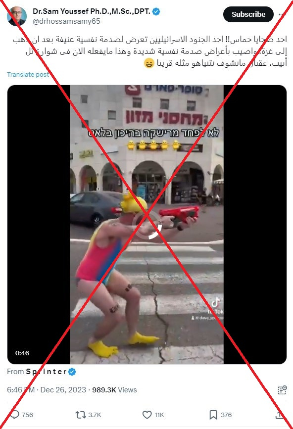 إلا أن الفيديو ليس هو ما تم تصويره على وسائل التواصل الاجتماعي، ولا يظهر جنديا إسرائيليا يتعرض لنوبة عصبية كما يدعي البعض. وتبين أن الفيديو عبارة عن مقطع مأخوذ من تطبيق “تيك توك” في 28 أكتوبر/تشرين الأول، وتم نشره على موقع يوتيوب قبل ذلك بيوم واحد، وهو نفس اليوم الذي بدأ فيه الهجوم البري الإسرائيلي على قطاع غزة المحاصر. ويستثنى من ذلك الادعاءات المتداولة على منصات التواصل الاجتماعي.