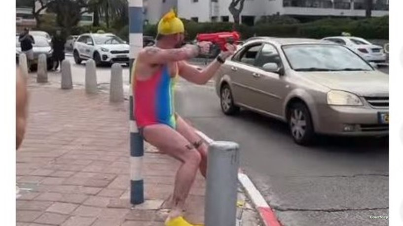 ويظهر في الفيديو رجل يرتدي ملابس غريبة وملونة ويحمل لعبة تشبه السلاح في أحد الشوارع ويقوم بحركات غريبة. وقال بالعبرية: “لا تخافي يا مورشكا، لا يوجد خوف. نركب السيارة بسرعة وننطلق.”