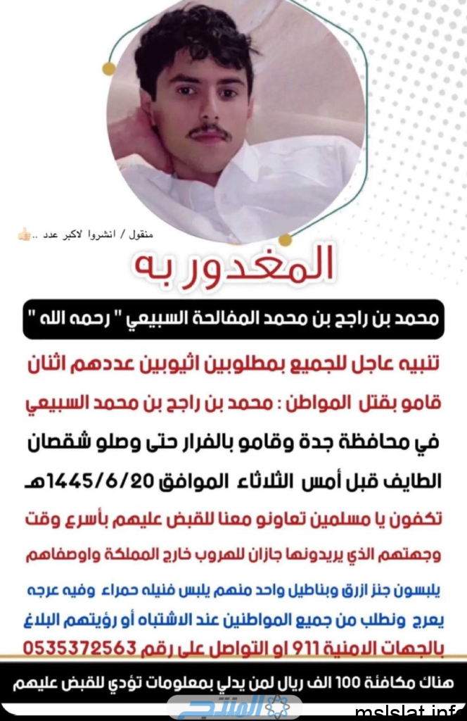 “تنبيه عاجل للجميع حول مطلوبين إثيوبيين قاما بقتل المواطن محمد بن راجح بن محمد السبيعي بمحافظة جدة ثم لاذوا بالفرار حتى وصلا الطائف أول أمس الثلاثاء 20/6/1445هـ. توقفوا أيها المسلمون، تعاونوا معنا للقبض عليهم في أسرع وقت ممكن. وجهتهم المطلوبة هي جازان. للهروب خارج المملكة، يوصفون بأنهم يرتدون الجينز والسراويل الزرقاء، وأحدهم يرتدي تي شيرت أحمر وله عرج. ونطلب من جميع المواطنين عند الاشتباه بهم أو رؤيتهم الإبلاغ عنهم للجهات الأمنية على الرقم 911 أو الاتصال على الرقم 0535372563. وهناك مكافأة قدرها 100 ألف ريال لمن يدلي بمعلومات تؤدي إلى القبض عليهم.