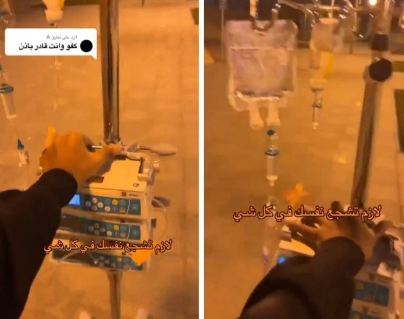 وتداول مستخدمو مواقع التواصل الاجتماعي مقطع فيديو لمريضة بالسرطان وهي تتجول بصحبة جهاز العلاج الكيميائي خارج المستشفى.