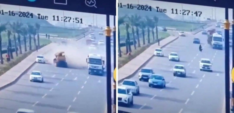 وأظهر الفيديو سيدة تحاول عبور الطريق السريع بين السيارات، قبل أن تسقط عليها جرافة تحمل شاحنة.