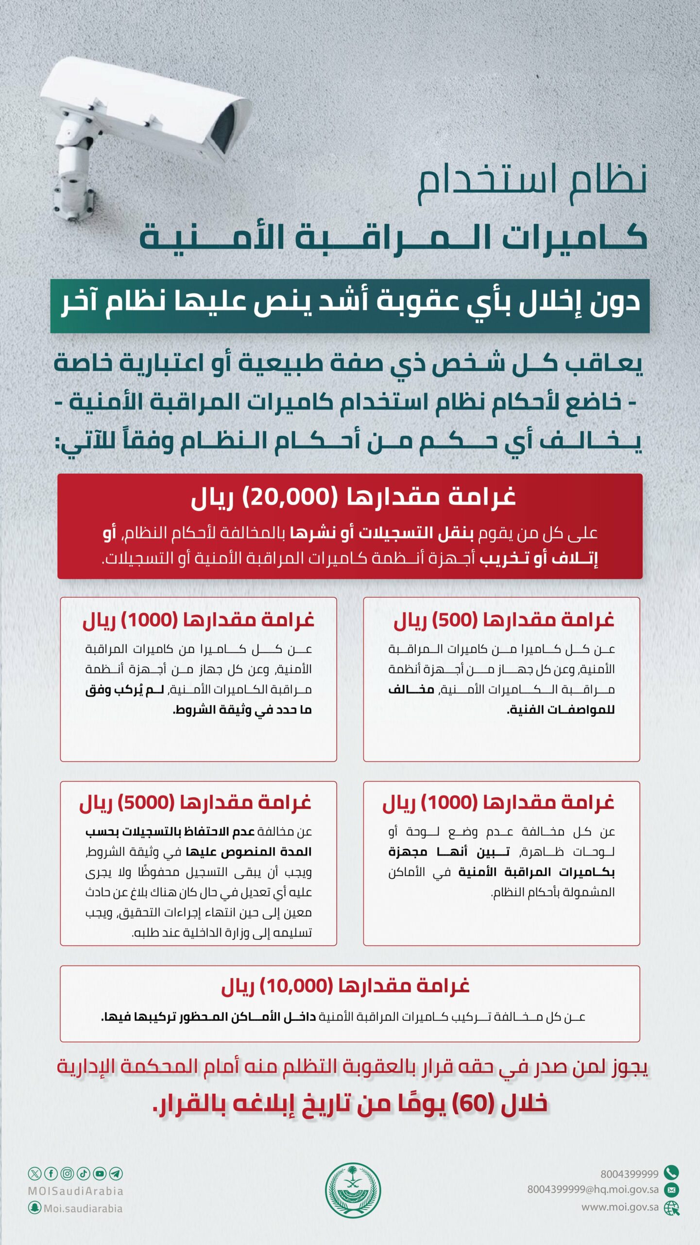 - مخالفة المواصفات: غرامة 500 ريال لكل كاميرا مراقبة أمنية، ولكل جهاز نظام مراقبة كاميرات مراقبة مخالف للمواصفات الفنية.