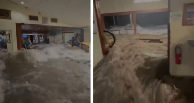 وكما أظهرت اللقطات، تطاير الأثاث وتحطم الزجاج، واندفع إلى القاعدة، فيما بدا أن المياه تتدفق إلى داخل المبنى.