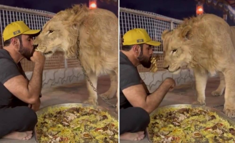 تناول قطع اللحم من فمه.. شاهد أسد يشارك مربيه وجبة كبسة