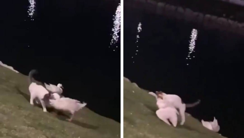 وثق مقطع فيديو متداول على مواقع التواصل الاجتماعي صراعا بين بطة وقطة على كورنيش الخبر.