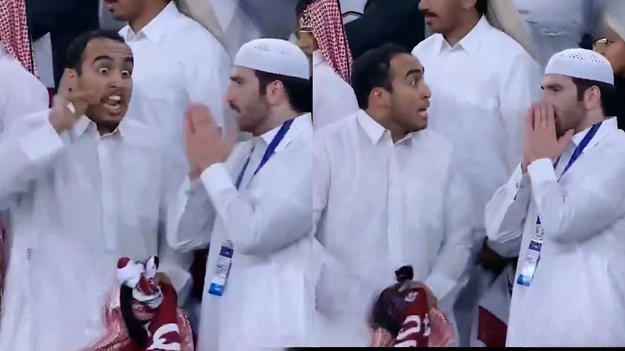 سجلت كاميرات ملعب الثمامة رد فعل أحد المشجعين القطريين على قرار الحكم إضافة 3 دقائق إلى 13 دقيقة وقت بدل ضائع في مباراة المنتخب القطري أمام نظيره الإماراتي في نصف نهائي كأس آسيا.