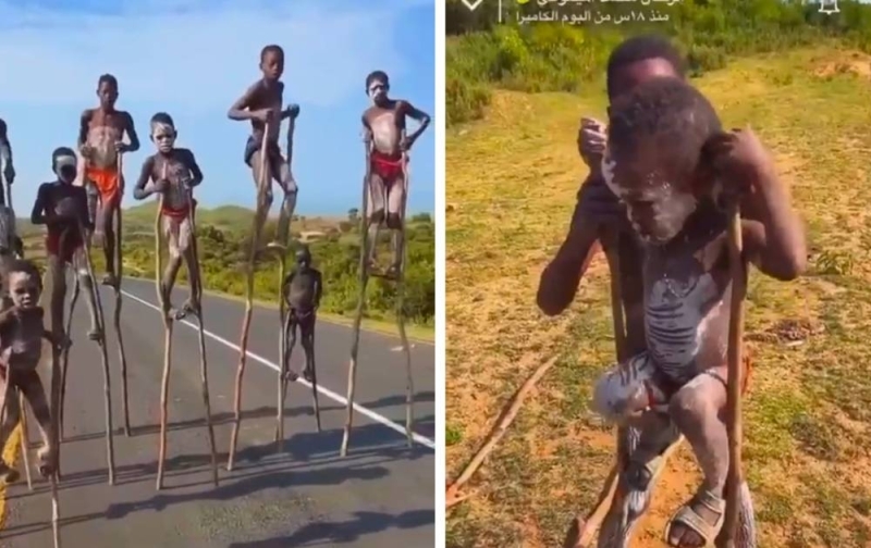 وأظهر مقطع الفيديو أفرادا من القبيلة وقد تم طلاء وجوههم وأجسادهم باللون الأبيض، بينما وقفوا يستعرضون مهاراتهم في المشي على عصا.