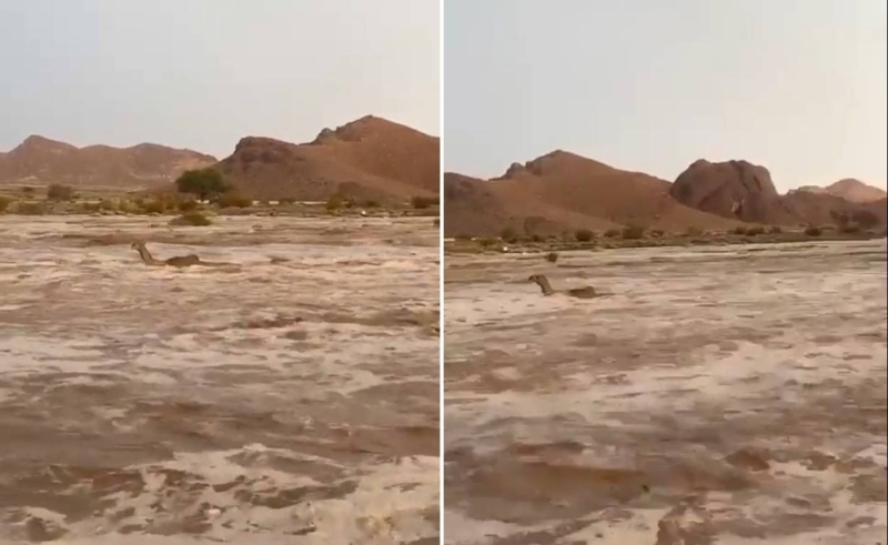 وظهرت الجمال في الفيديو وهي غارقة في المياه العميقة، ولم يظهر سوى رؤوسها أثناء محاولتها إنقاذ نفسها والخروج من الفيضانات.