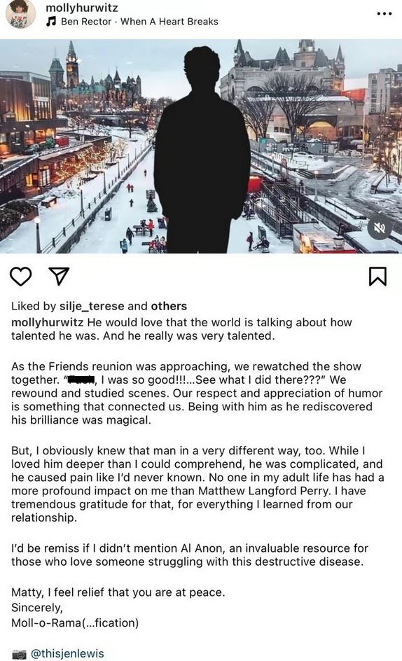 أثارت الممثلة مولي هورويتز الجدل بمنشورها على إنستغرام الذي تحدثت فيه عن خطيبها السابق الممثل ماثيو بيري، الذي توفي يوم السبت الماضي عن عمر يناهز 54 عاماً.